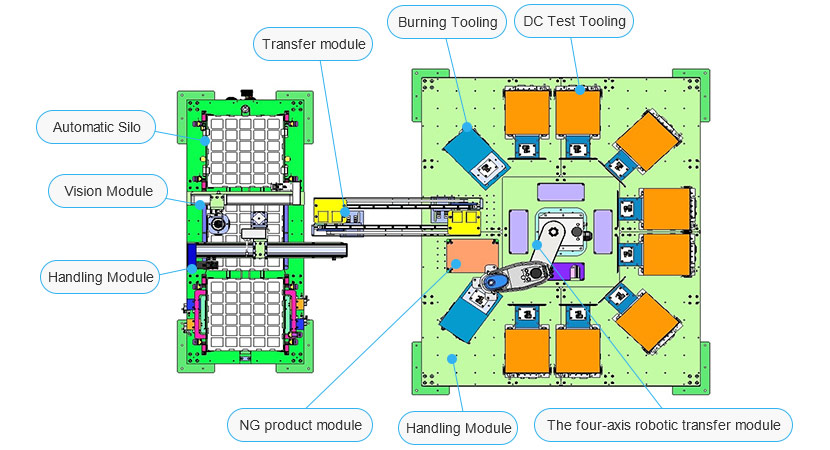 Handling Module: moving the products to be tested to the transfer module through visual guidance, and transferring the qualified products from the transfer module to the tray.